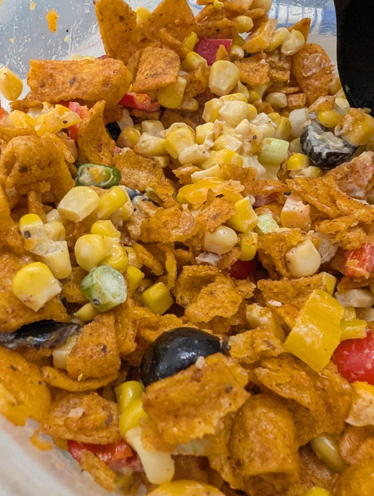 In a bowl combine; corn, cheese, mayonnaise, pepper, onion and olives. Right before serving, crush chips and stir into “salad”.