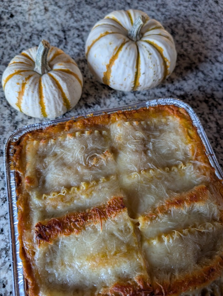 6. Assemble the lasagna in layers, starting with the pumpkin mixture, then noodles, followed by 1/3 of the cheese mixture.
