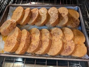 2.        Whisk together eggs, creamer, pumpkin, maple syrup, and salt in a medium bowl; pour into a shallow dish. Soak bread slices in egg mixture, turning once, until well soaked. Shingle bread slices in prepared pan; sprinkle with pumpkin pie spice.