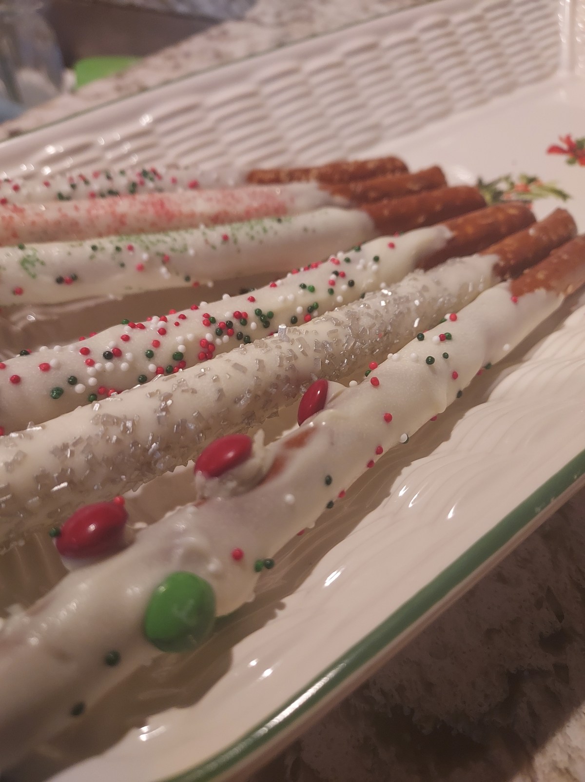 - Dip the pretzel rods into melted chocolate, tilting the glass to easily cover as much of the pretzel as you want. Use the side and rim of the glass to remove excess. Place on baking sheet. Sprinkle with sprinkles