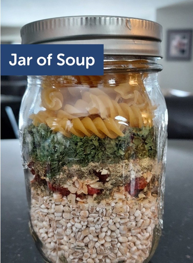 As we continue our month of JOY-uary, we found another way to spread a JAR of JOY! This is easy to make and can be a sweet gift for someone. Make a dozen of them to have on hand for someone recovering from surgery or just to brighten someone’s day! I added half a cup of corkscrew pasta because the jar wasn’t full. You could add more barley to fill it instead.