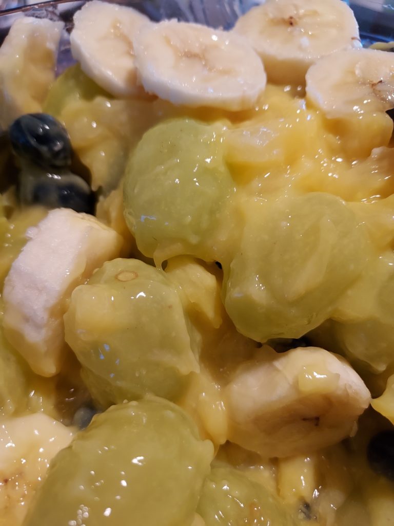 Mix everything together (including the juice from the can of pineapple) and chill at least 3 hours before serving. Make sure to add the bananas right before putting it on the table so they don’t get brown.