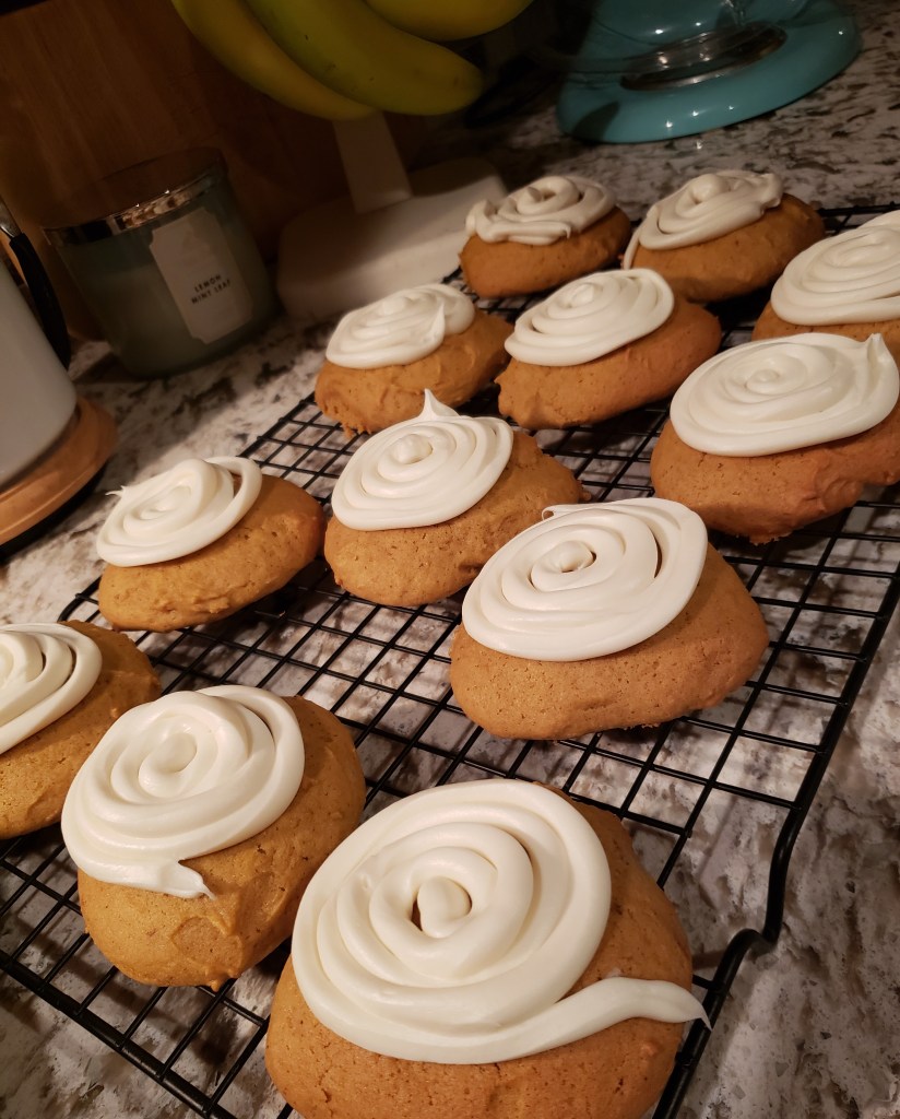 Drop on cookie sheet by tablespoonfuls and flatten slightly. Bake for 15 to 20 minutes in the preheated oven. Cool cookies, then frost. (we use cream cheese frosting)